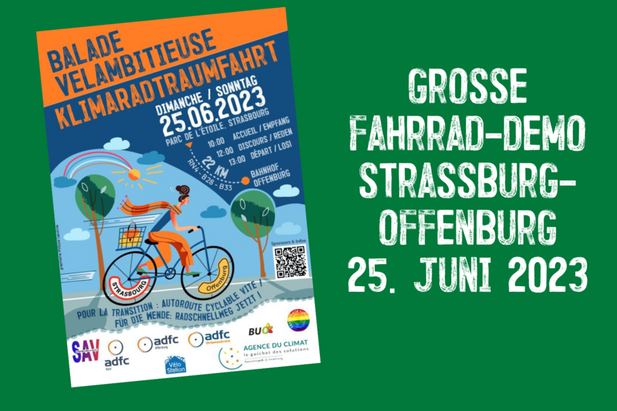 Die Demo-Radtour von Straßburg nach Offenburg wird rund zwei Stunden dauern, alle sind willkommen und dürfen mitradeln! Start ist um 13 Uhr am Parc de l'Étoile in Straßburg. Interessierte werden dort bereits ab 10 Uhr in Empfang genommen.
