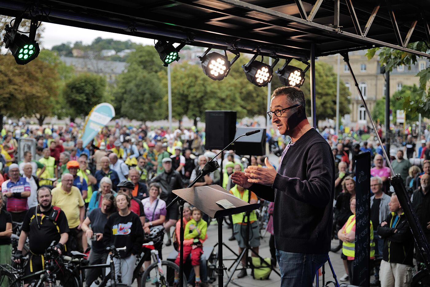 Auf der Abschlusskundgebung forderte Verkehrsminister Winfried Hermann mehr Mut zum weiteren Ausbau der Radinfrastruktur. „Wir haben im Land 800 Kilometer Radwege hinzugebaut, doch das reicht nicht: Es braucht ein Radnetz, auf dem jede und jeder sicher unterwegs sein kann.“ Die Demonstrierenden auf der Radsternfahrt forderten Radwege an Landes- und Bundesstraßen, mehr Radschnellwege und den schnelleren Ausbau des Radnetzes. „Das war ein tolles Zeichen für die Verkehrswende. Jetzt sind die Kommunen am Zug, solche direkten, sicheren Radwege vor der eigenen Haustür zu schaffen“, resümiert Matthias Zimmermann.